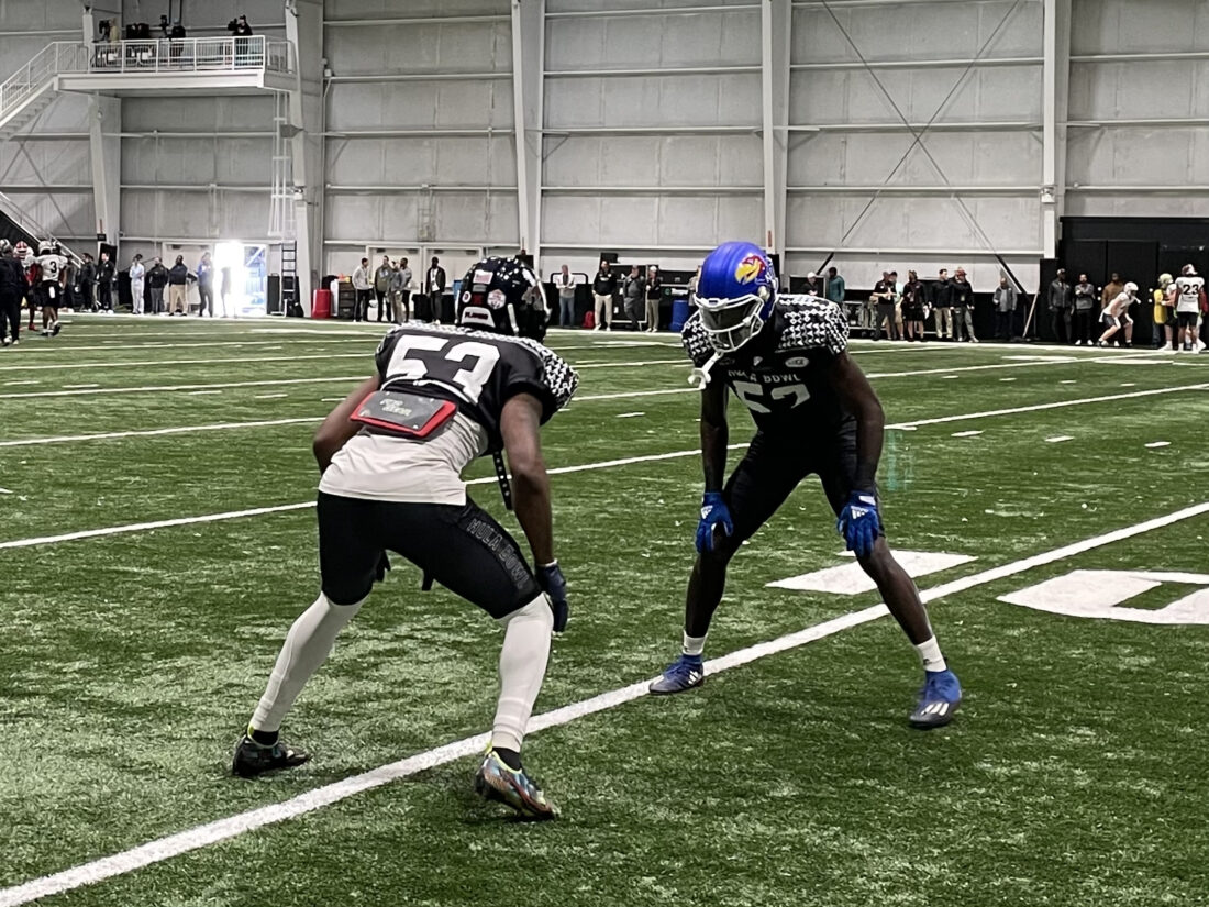 Kansas linebacker Craig Young goes through drills at Hula Bowl practice at Nicholson Fieldhouse in Orlando, Fla., on Wednesday, Jan. 10, 2024.