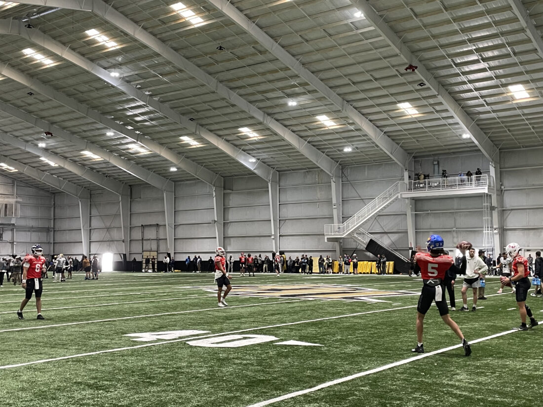 Kansas quarterback Jason Bean plays catch with Northwestern quarterback Ben Bryant during Hula Bowl practice at Nicholson Fieldhouse in Orlando, Fla., on Wednesday, Jan. 10, 2024.