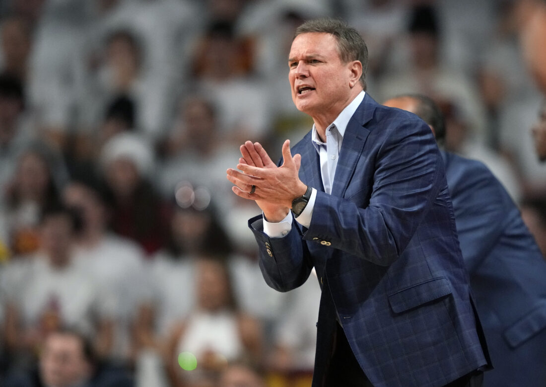 Kansas head coach Bill Self directs his players late in the second half of an NCAA college basketball game against Iowa State, Saturday, Jan. 27, 2024, in Ames, Iowa. Iowa State won 79-75.