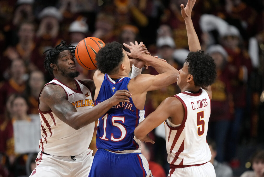 Iowa State forward Tre King (0) pokes the ball from Kansas guard Kevin McCullar Jr. (15) as Iowa State guard Curtis Jones (5) defends during the second half of an NCAA college basketball game, Saturday, Jan. 27, 2024, in Ames, Iowa. King was charged with a foul on the play. Iowa State won 79-75.