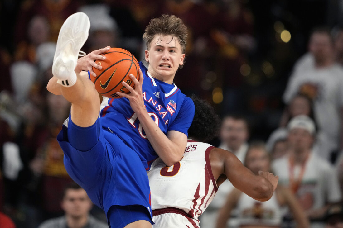 Kansas guard Johnny Furphy (10) comes down with the ball as he lands on Iowa State guard Curtis Jones (5) during the second half of an NCAA college basketball game, Saturday, Jan. 27, 2024, in Ames, Iowa. Iowa State won 79-75.