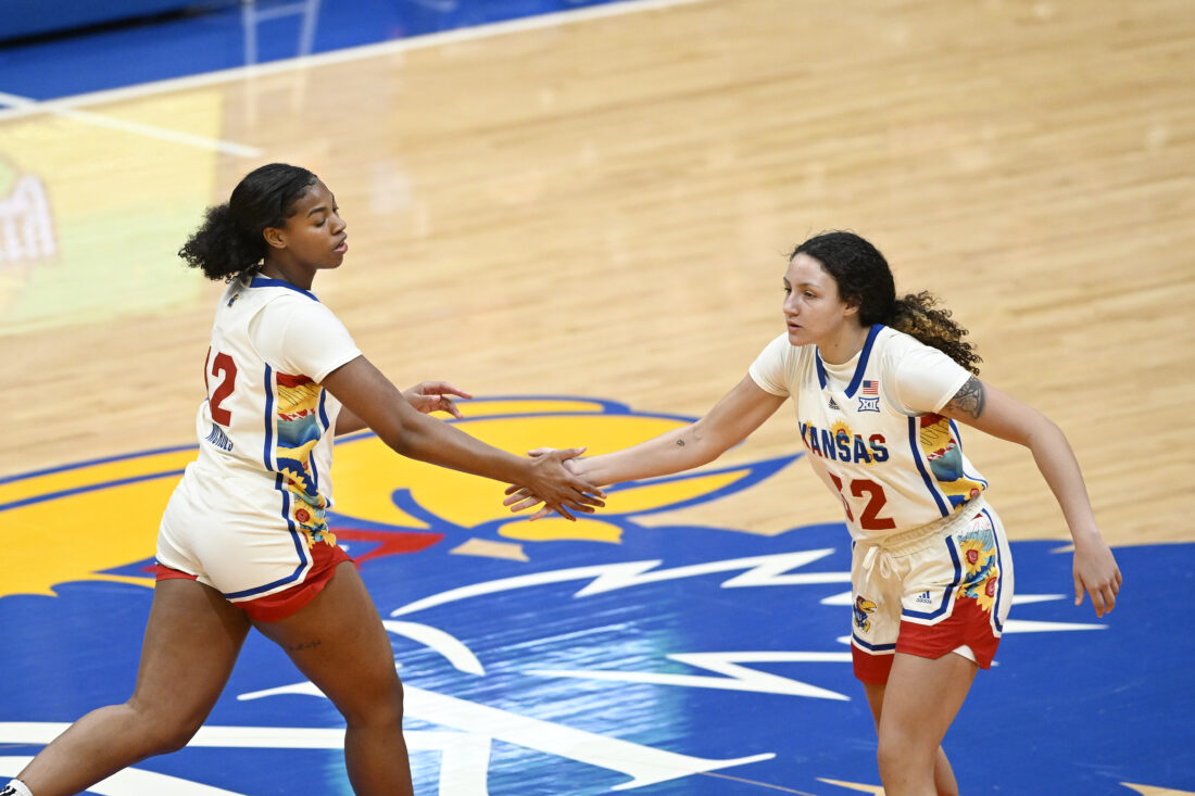 Kansas guards S’Mya Nichols and Skyler Gill high-five midcourt after a basket Wednesday, Jan. 31, 2024, in Allen Fieldhouse.