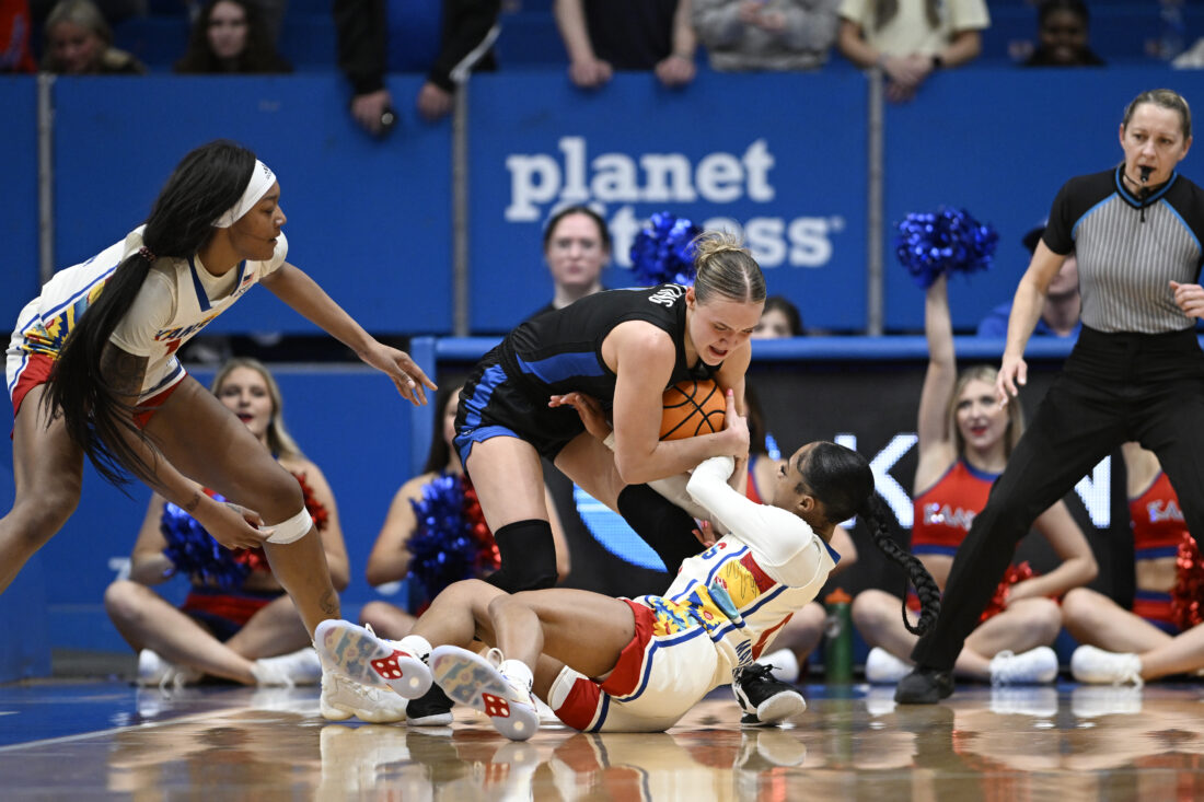 Kansas guard Wyvette Mayberry holds on for a tie-up with BYU’s Amari Whiting Wednesday, Jan. 31, 2024, in Allen Fieldhouse.