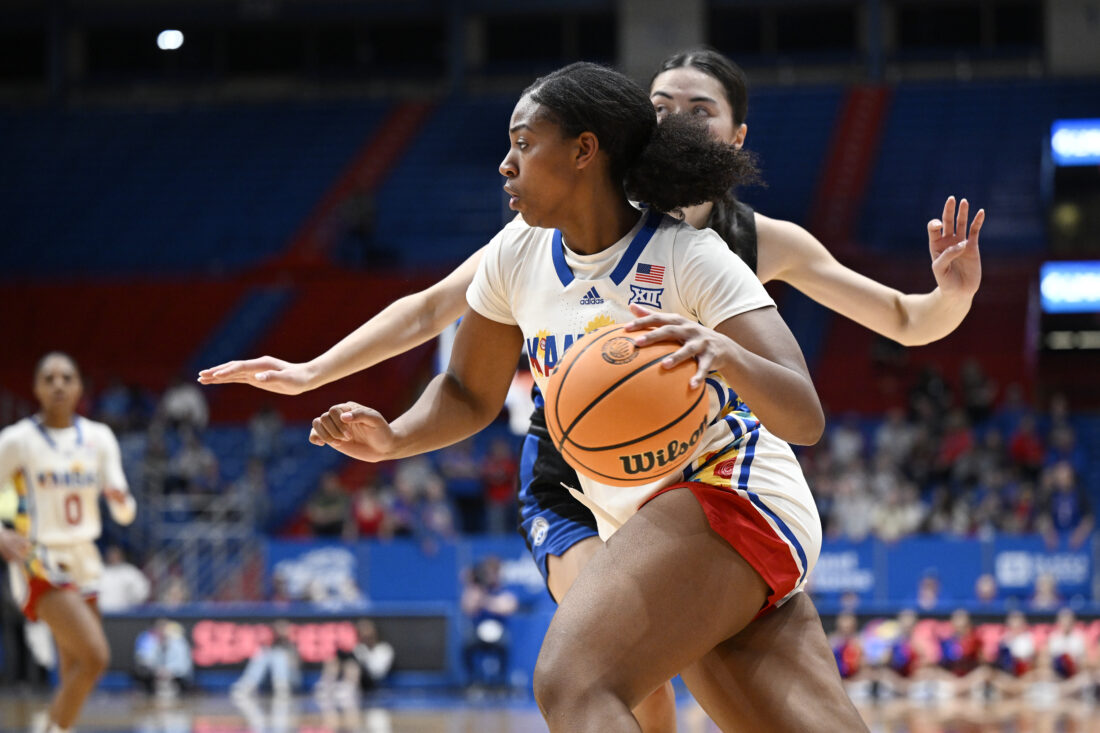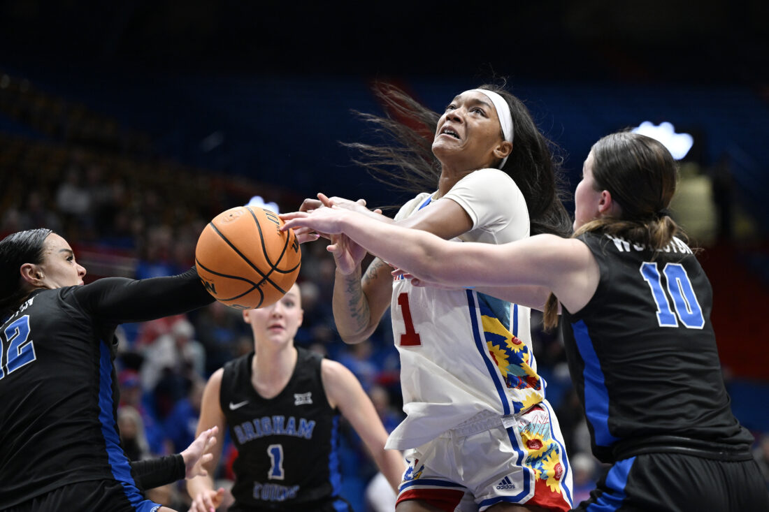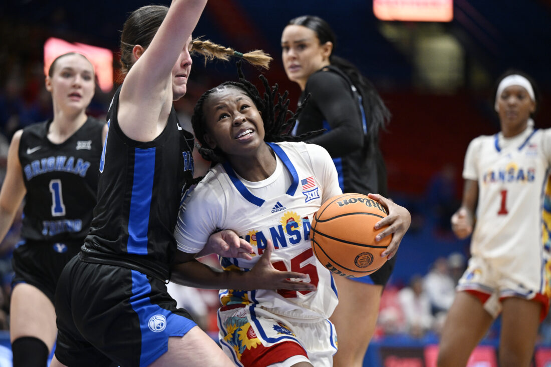 Kansas center Taiyanna Jackson is heavily defended while driving to the basket Wednesday, Jan. 31, 2024, against BYU.