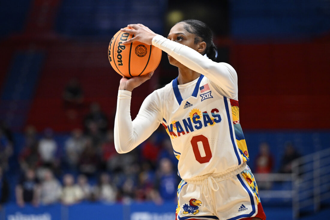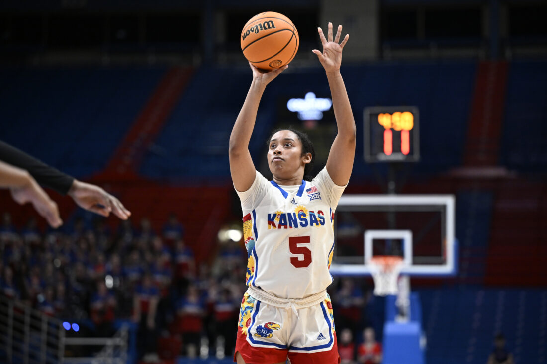 Kansas guard Wyvette Mayberry lines up a 3-pointer against BYU Wednesday, Jan. 31, 2024, at Allen Fieldhouse.