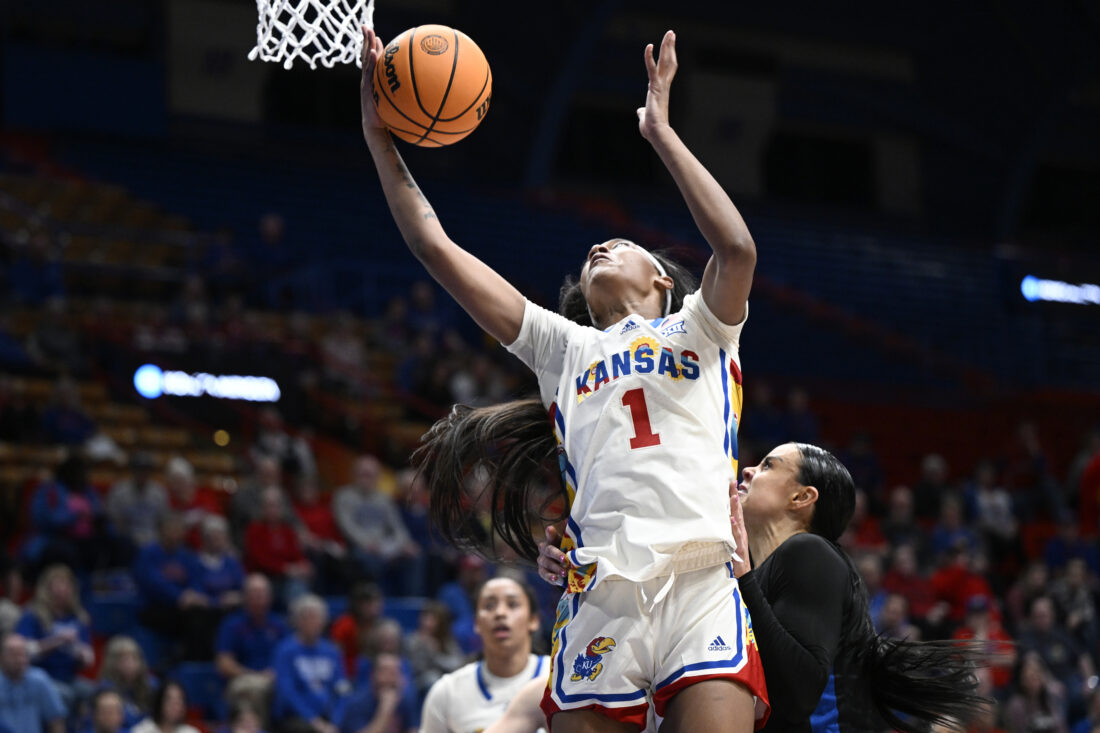Kansas center Taiyanna Jackson puts up a two-handed layup against BYU Wednesday, Jan. 31, 2024, in Allen Fieldhouse.