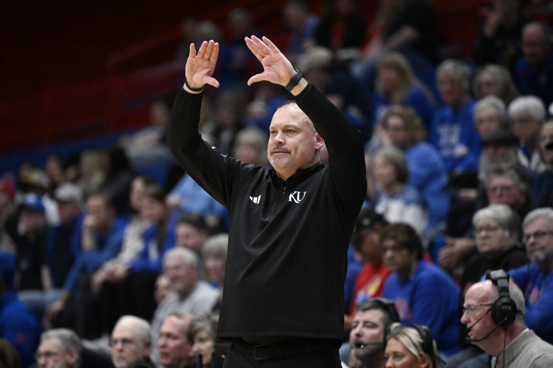 Kansas head coach Brandon Schneider calls out a play against BYU Wednesday, Jan. 31, 2024, in Allen Fieldhouse.