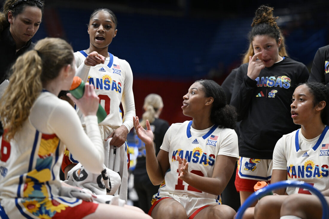 Members on the Kansas team share a spirited conversation during a timeout Wednesday, Jan. 31, 2024, against BYU.