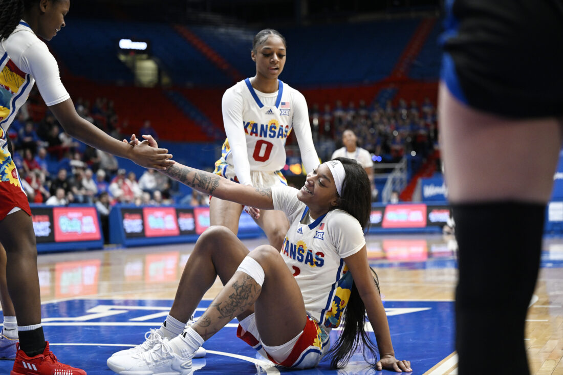 Kansas center Taiyanna Jackson smiles as she is helped up by a teammate after scoring a basket while being fouled Wednesday, Jan. 31, 2024, against BYU.