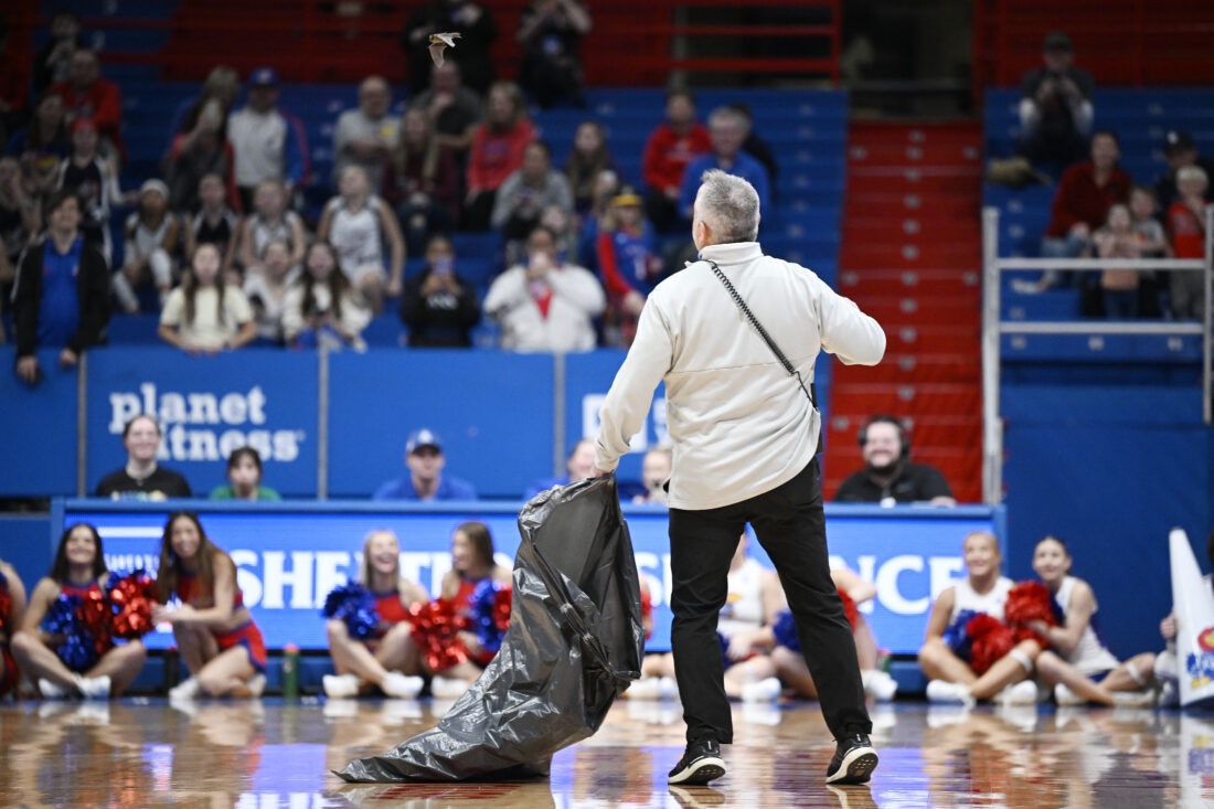 A member of facilities tries to catch a bat that caused a delay in the game Wednesday, Jan. 31, 2024, in Allen Fieldhouse.