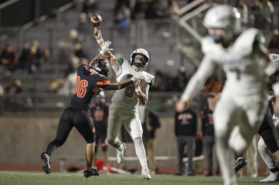 Free State junior Finn Moore releases a pass against Shawnee Mission Northwest at Shawnee Mission District Stadium, North Location, on Friday, Nov. 7, 2025 in Overland Park.