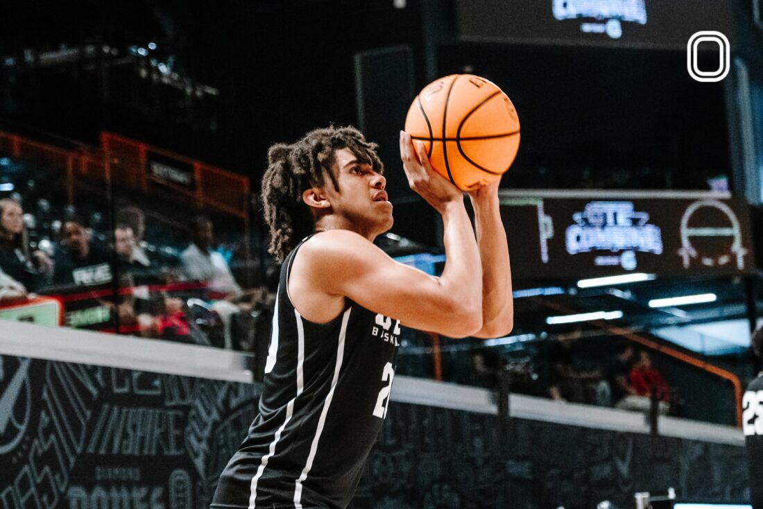 Taylen Kinney lines up a shot at the Overtime Elite combine on Tuesday, Sept. 24, 2024, in Atlanta.