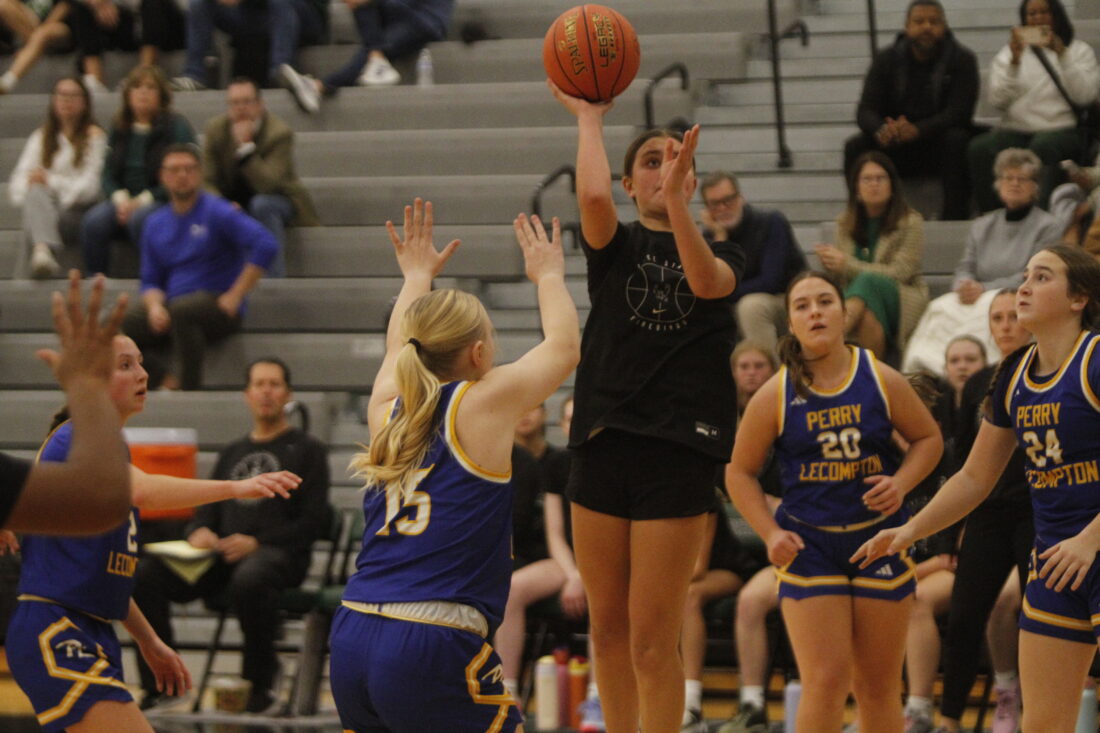 Free State freshman Morgan McClorey begins her shot during Free State’s girls basketball jamboree against Wellsville, Ottawa and Perry-Lecompton at Free State High School on Tuesday, Nov. 25, 2025, in Lawrence.