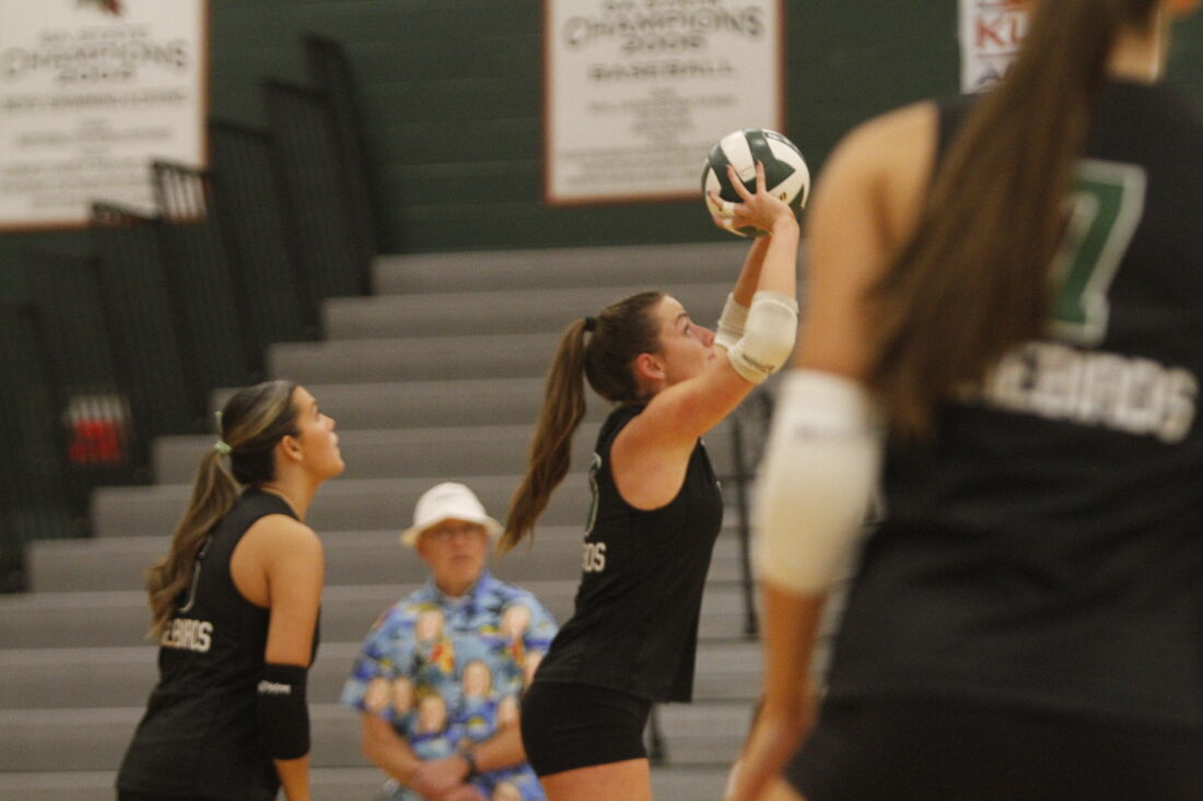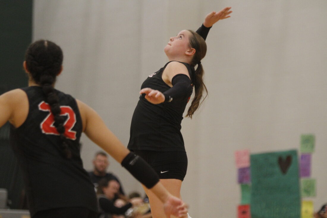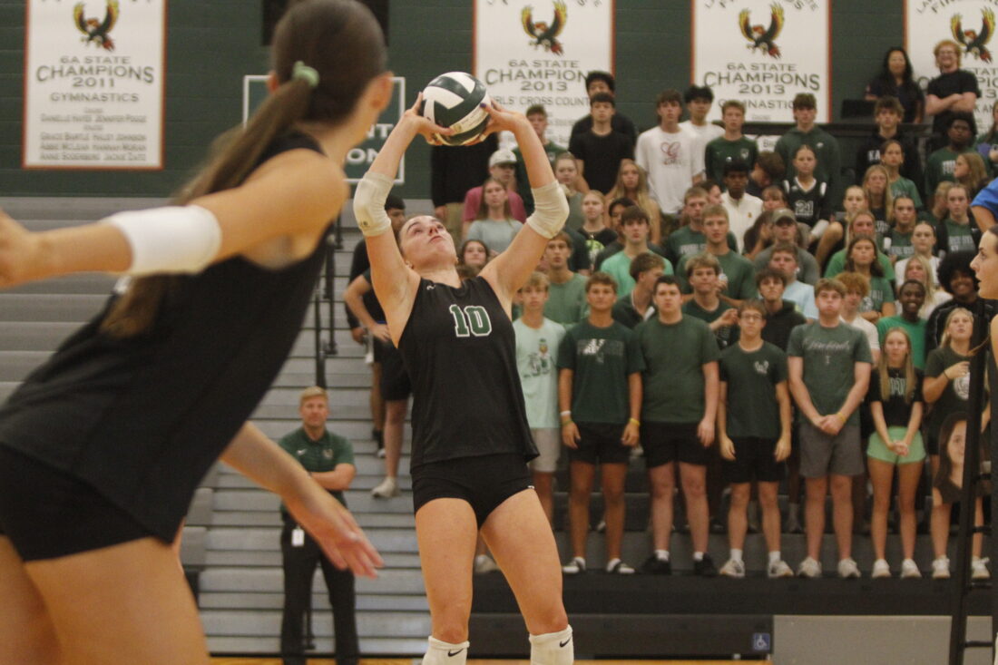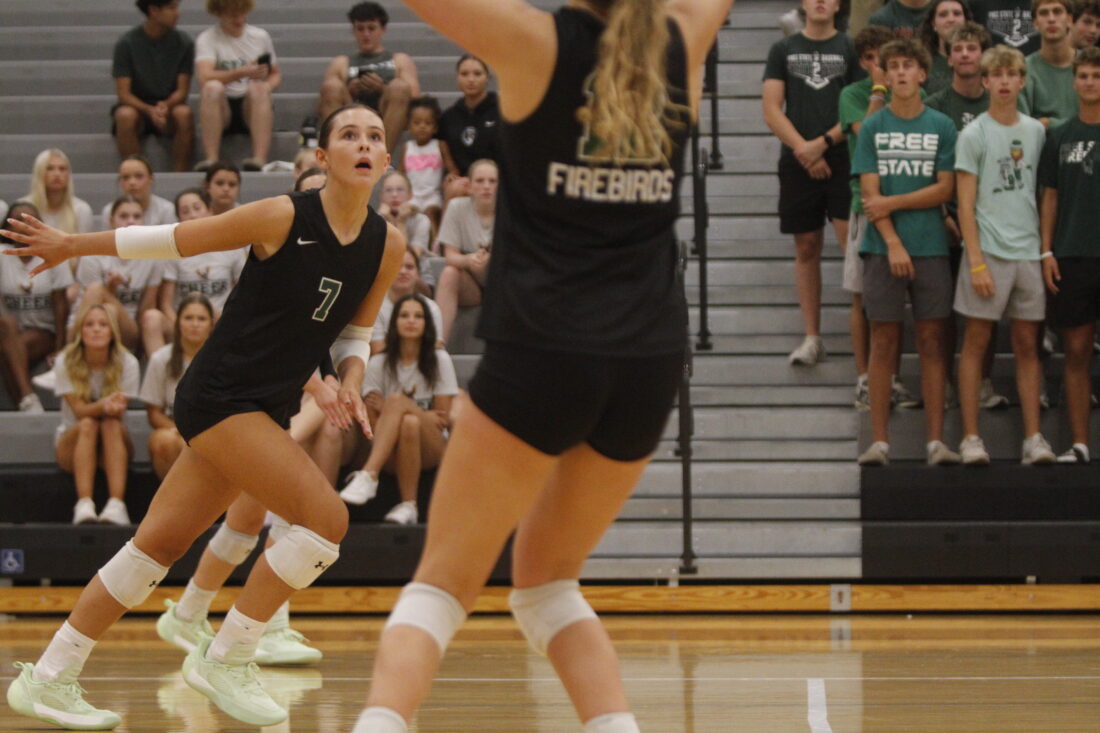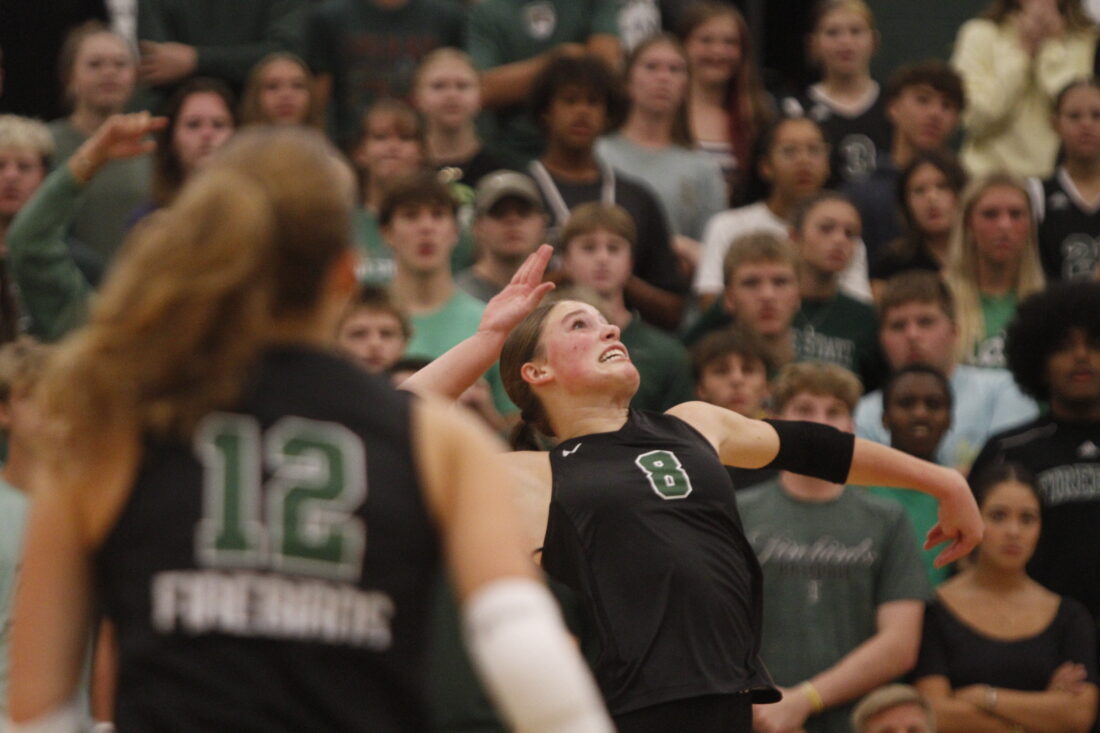 Free State junior middle blocker Anniston Clark sets the ball in a 3-1 win over Lawrence at Free State High School on Thursday, Oct. 2, 2025, in Lawrence.