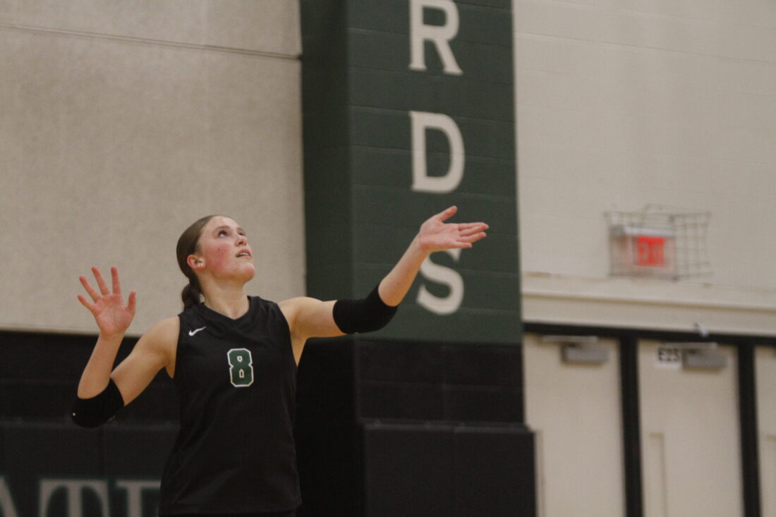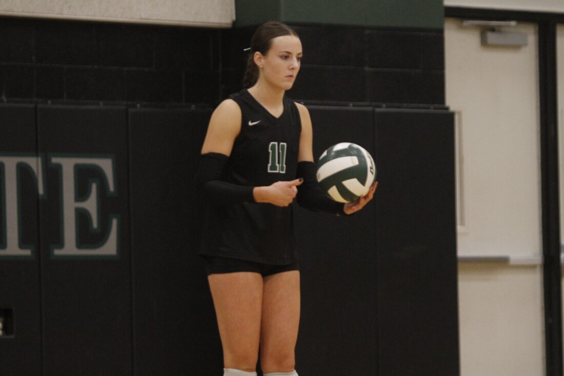 Free State senior middle blocker Kennedy Flachsbarth starts to serve in a 3-1 win over Lawrence at Free State High School on Thursday, Oct. 2, 2025, in Lawrence.