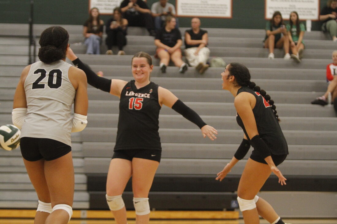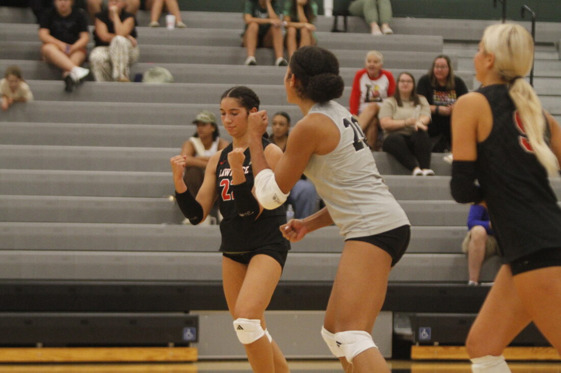 Lawrence celebrates a point in a 3-1 loss to Free State at Free State High School on Thursday, Oct. 2, 2025, in Lawrence.