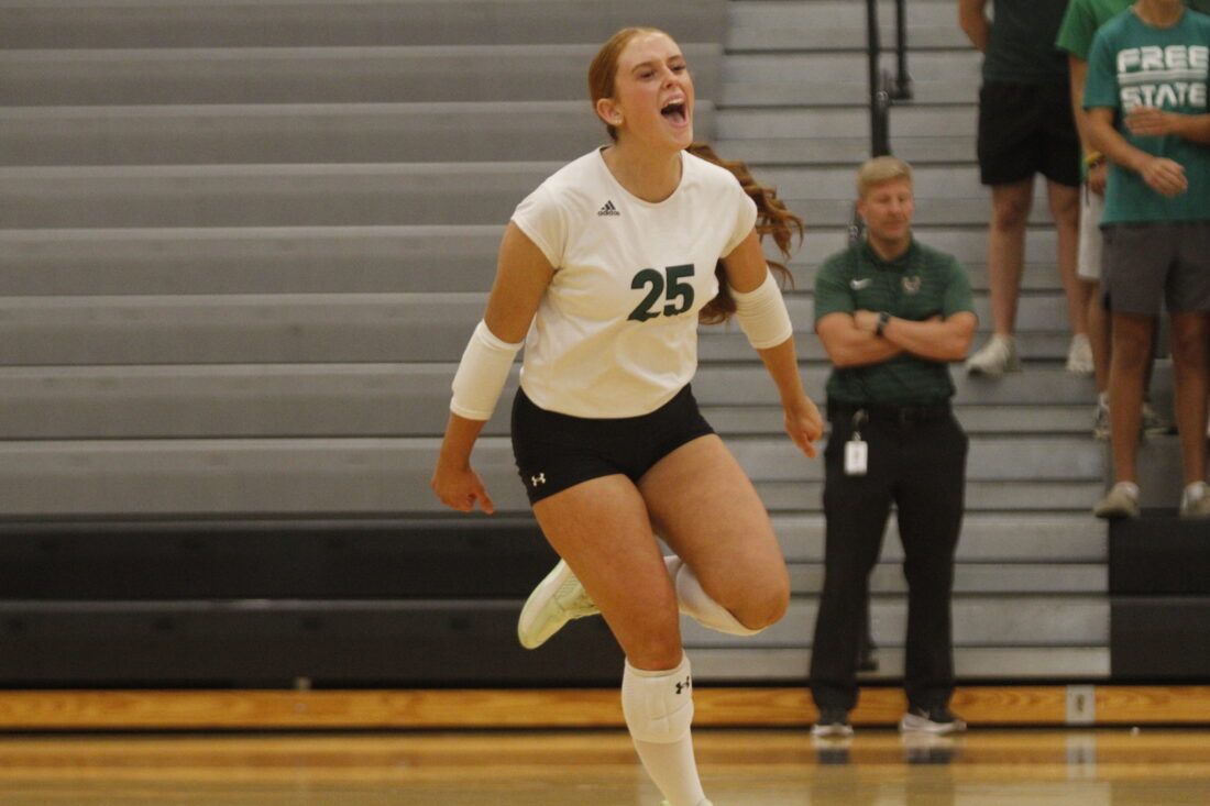Free State senior libero Ava Corbin celebrates a point in a 3-1 win over Lawrence at Free State High School on Thursday, Oct. 2, 2025, in Lawrence.