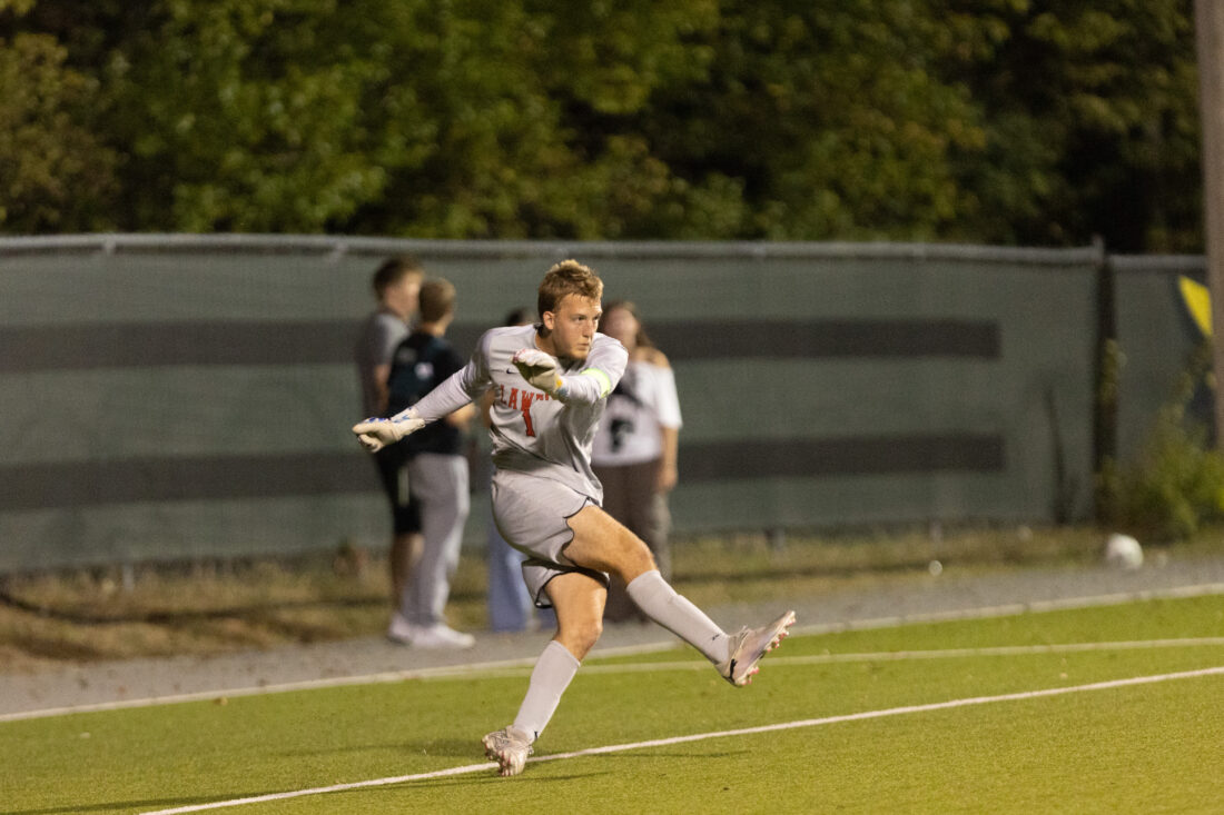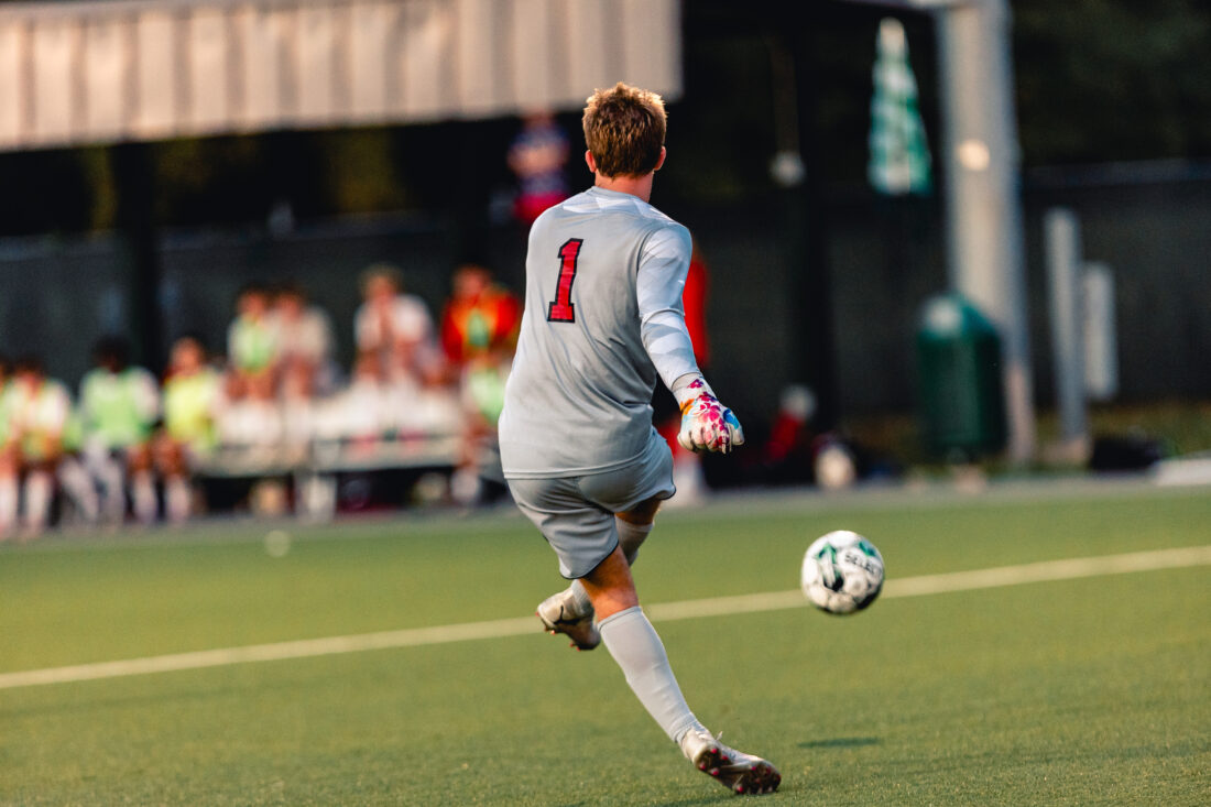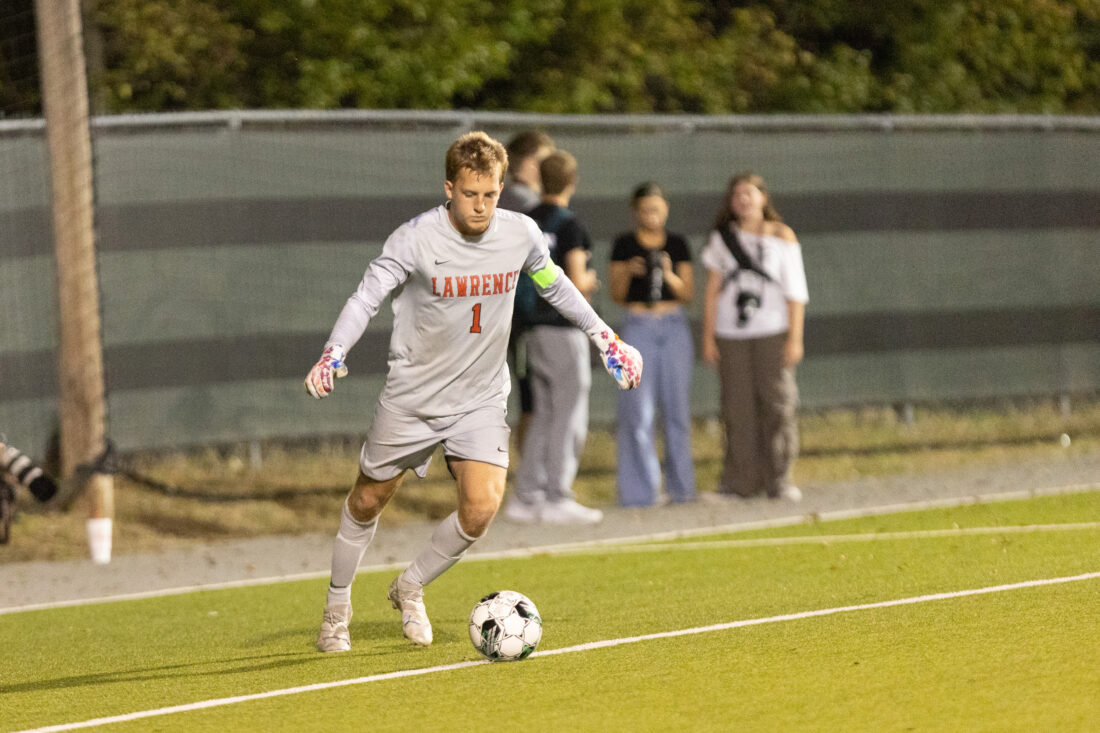 Lawrence senior goalie Murphy Nowak prepares to kick the ball to teammates during the City Showdown against Free State on Thursday, Sept. 18, 2025, at Free State High School.