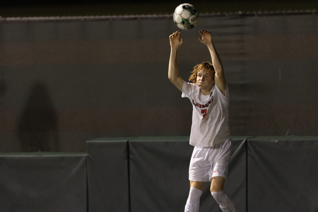 Lawrence junior Oscar Paden throws the ball in from the sideline during the City Showdown against Free State on Thursday, Sept. 18, 2025, at Free State High School.