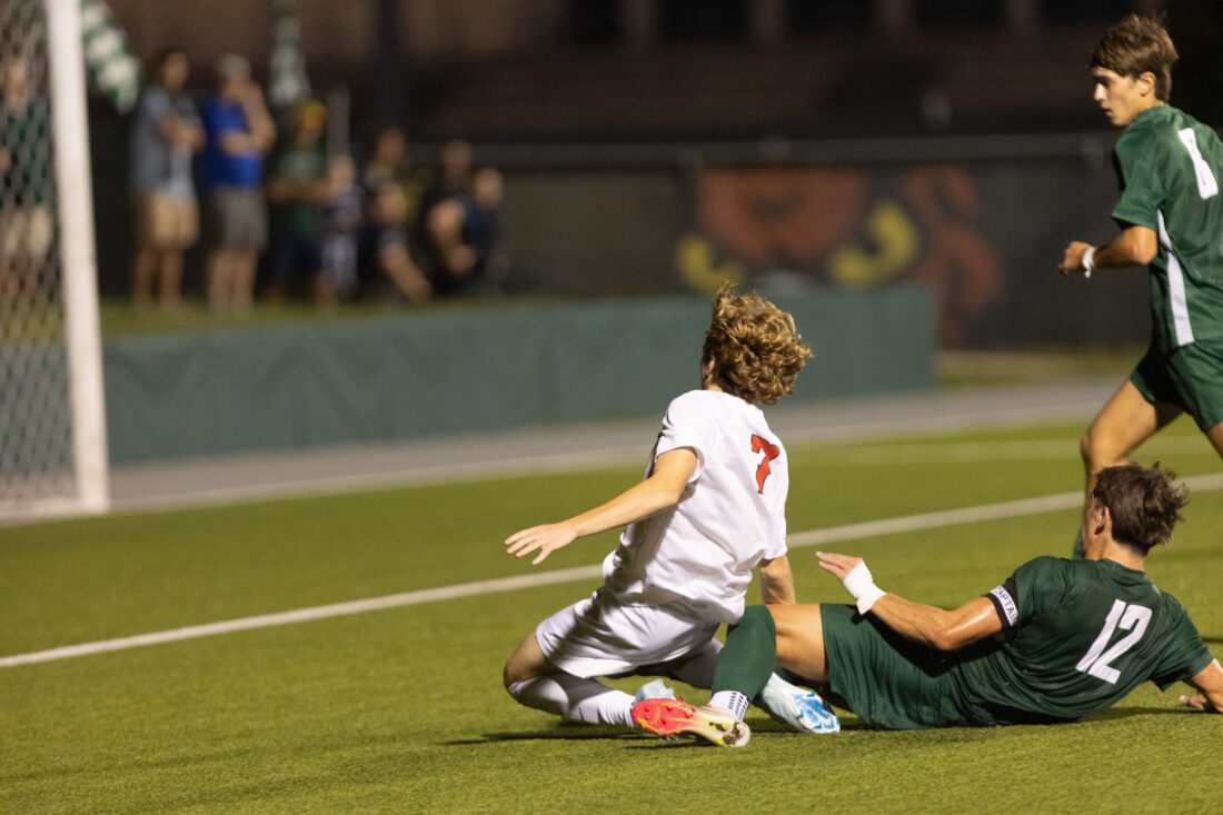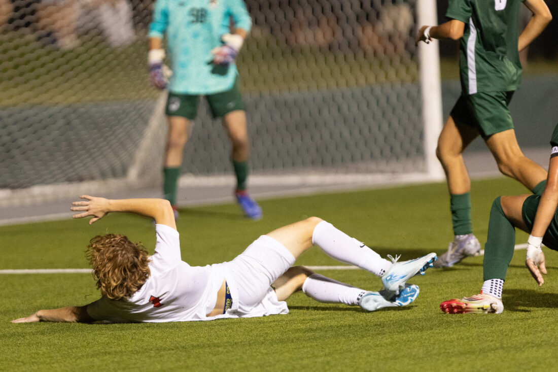Lawrence junior Oscar Paden slides while attempting a shot against Free State on Thursday, Sept. 18, 2025, at Free State High School.