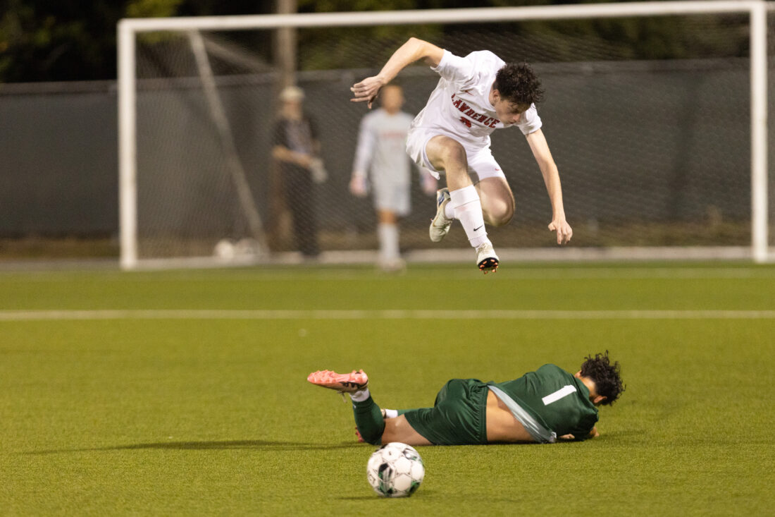 Lawrence junior Riley Stewart jumps over a Free State defender during the City Showdown on Thursday, Sept. 18, 2025, at Free State High School.