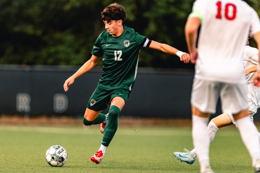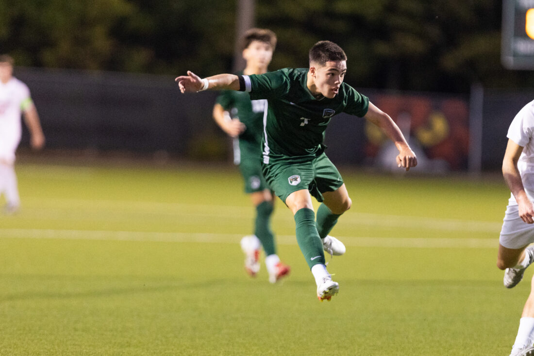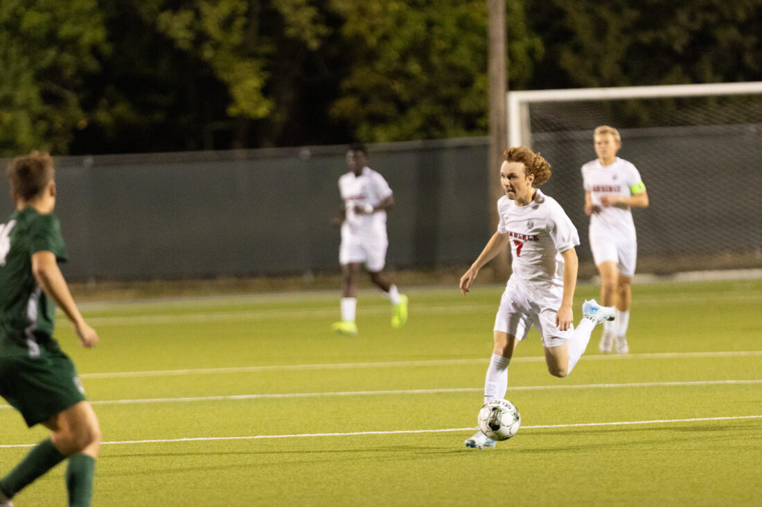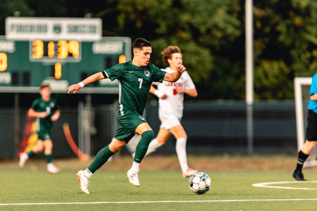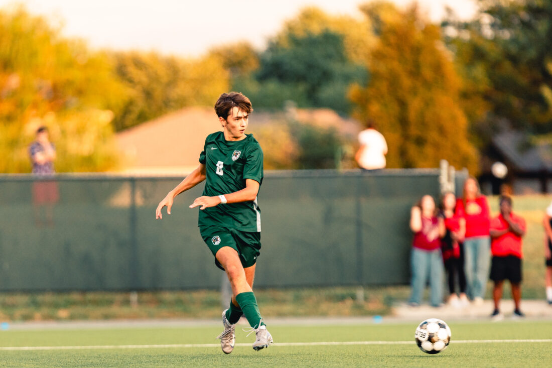 Free State senior forward Trenton Cozadd dribbles the ball down the field against Lawrence on Thursday, Sept. 18, 2025, at Free State High School.