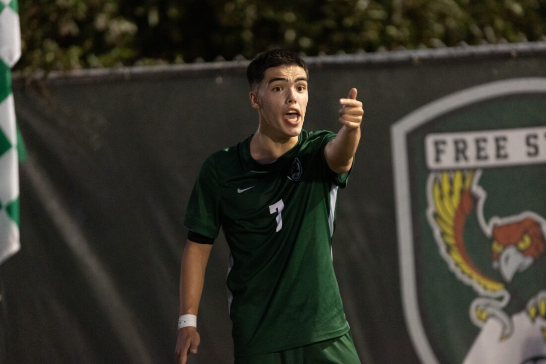 Free State senior midfielder Eli Stone calls a play during a corner kick against Lawrence on Thursday, Sept. 18, 2025, at Free State High School.