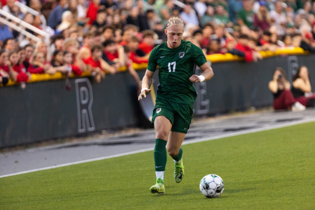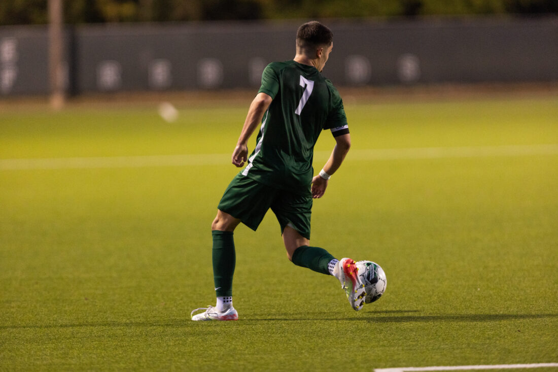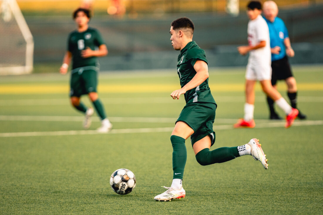 Free State senior midfielder Eli Stone dribbles the ball down the field against Lawrence on Thursday, Sept. 18, 2025, at Free State High School.