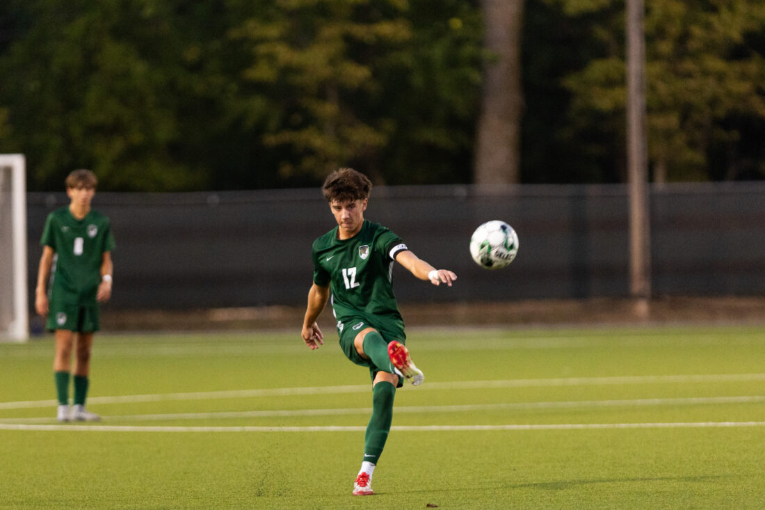 Free State junior defender Raleigh Jeter kicks the ball against Lawrence on Thursday, Sept. 18, 2025, at Free State High School.
