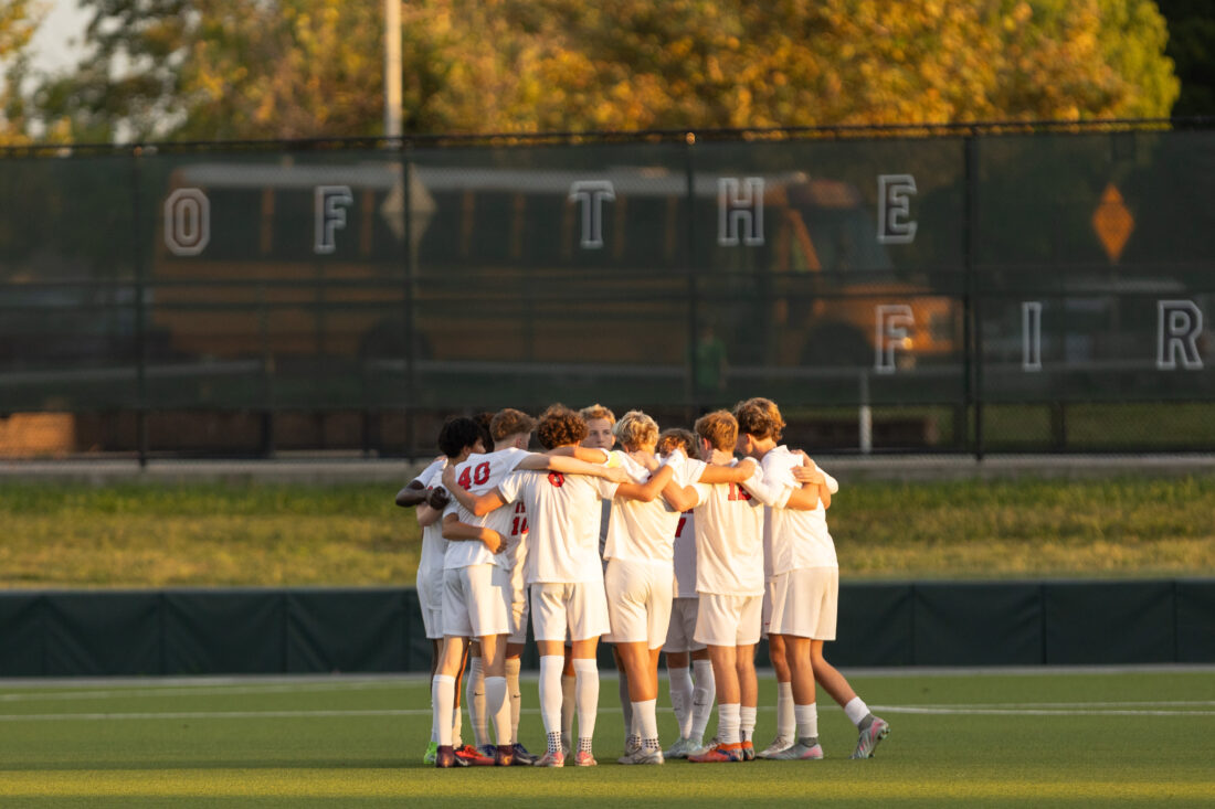 The Lawrence varsity boys soccer team huddles before the match against Free State on Thursday, Sept. 18, 2025, at Free State High School.