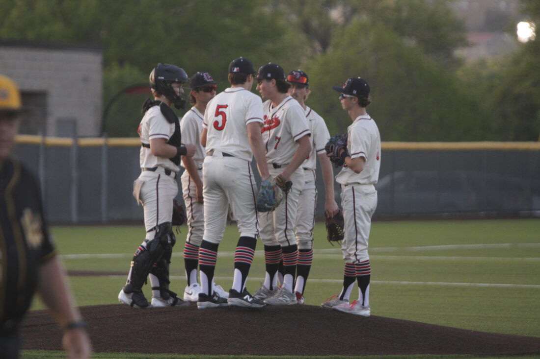 The Lawrence infield visits with pitcher Brady Wollesen in a 2-1 loss to Shawnee Mission West on Thursday, April 16, 2026, in Lawrence.