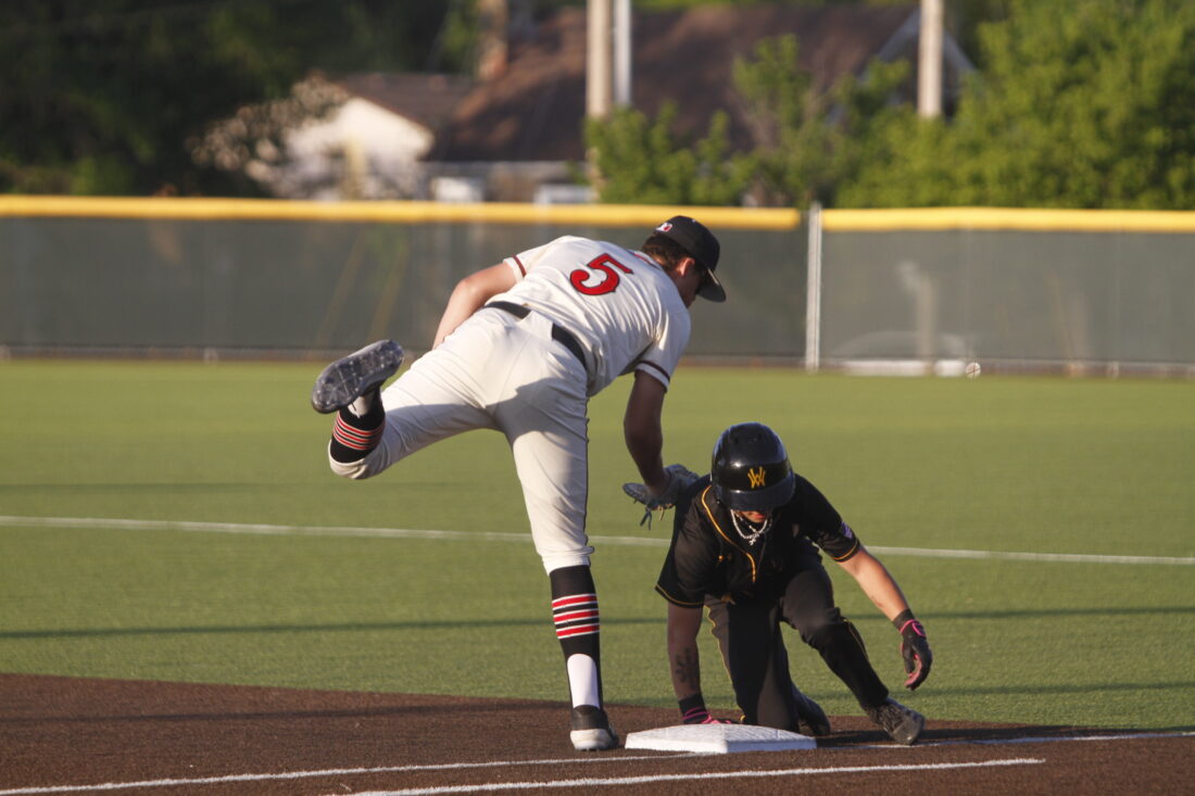 Lawrence first baseman Hudson Hardesty tags a runner in a 2-1 loss to Shawnee Mission West on Thursday, April 16, 2026, in Lawrence.