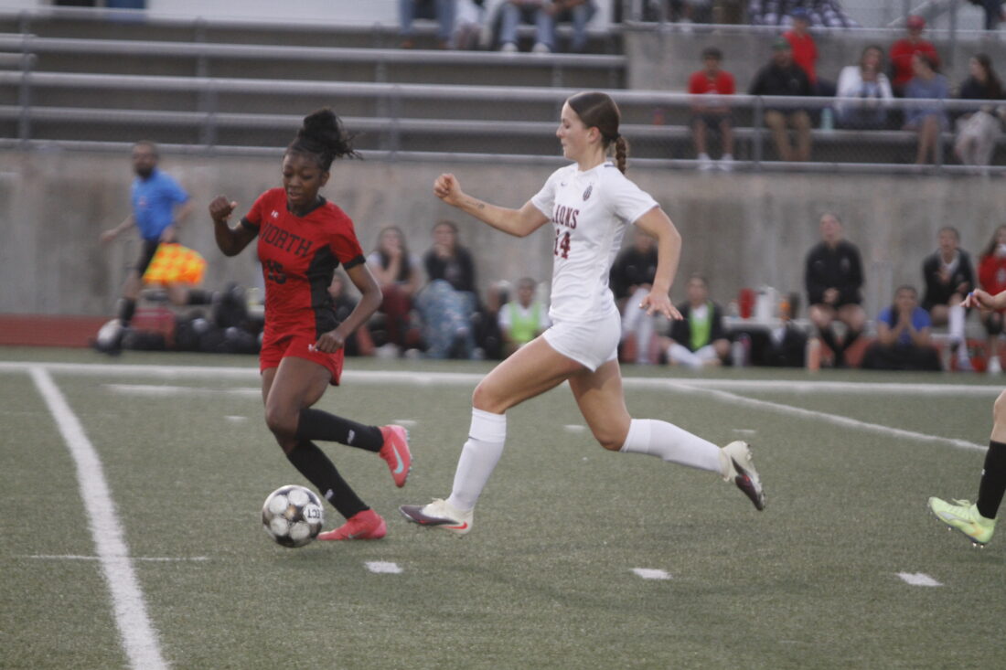 Lawrence senior Ginny Besson catches up with the ball in a road win over Shawnee Mission North on Tuesday, April 21, 2026 in Overland Park.