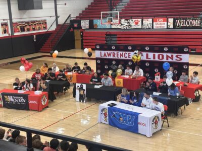 Eight Lawrence High seniors signed their collegiate letters of intent in the Lawrence gym on Wednesday, Feb. 4, 2026, in Lawrence.