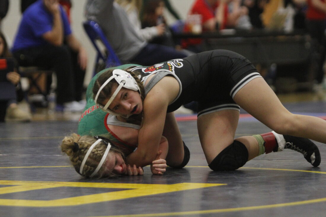 Free State’s Jessica Berg gets a pin in the 5th Annual Leavenworth Challenger on Saturday, Dec. 6, 2025, in Leavenworth.