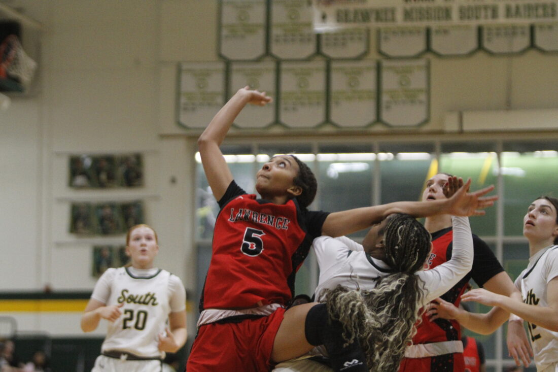 Lawrence freshman Marley Doleman jumps through a defender on a layup in a loss to Shawnee Mission South on Tuesday, Feb. 10, 2026, in Overland Park.