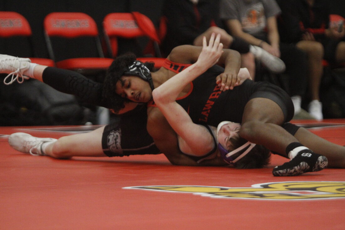 Lawrence’s Drennen Shorter pins his opponent in a home dual on Wednesday, Jan. 14, 2026, in Lawrence.