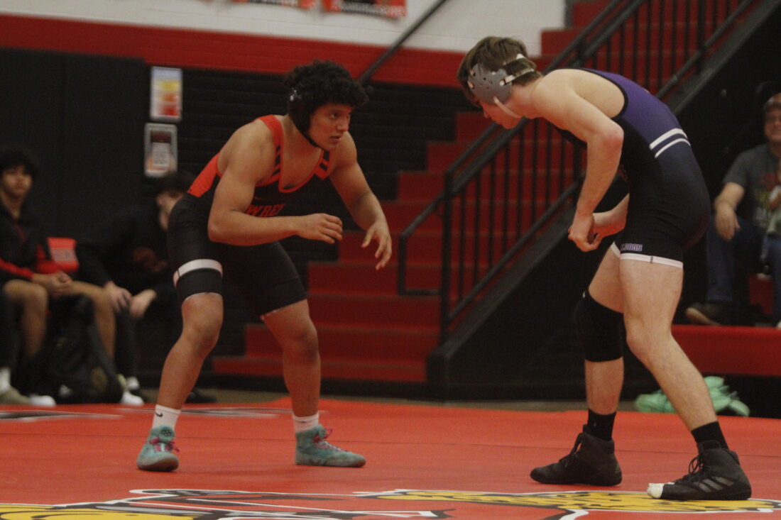 Lawrence’s Kayden Hernandez and Baldwin’s Zevian Prather circle each other in a home dual on Wednesday, Jan. 14, 2026, in Lawrence.