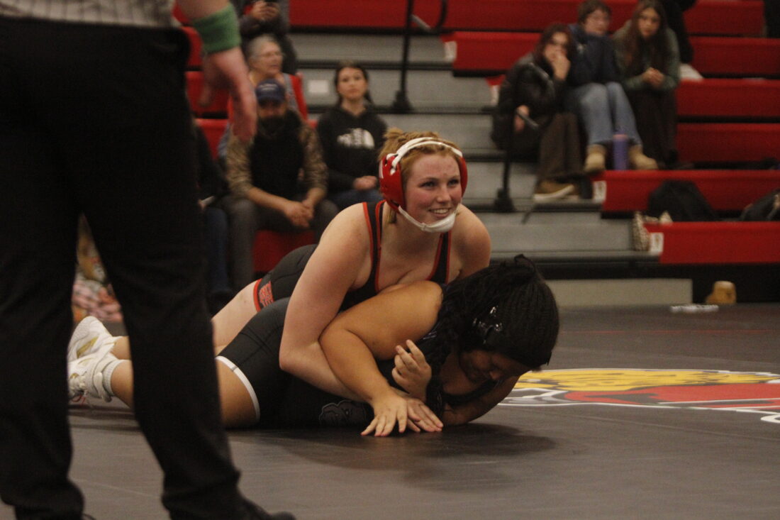 One of Lawrence’s two wins came in the first complete match, with Annabelle Ackerman pinning Lydia Payne in the 115-pound weight class. Baldwin’s Lillian Crites pinned NeFehna Farve in 47 seconds in the 120-pound bout.