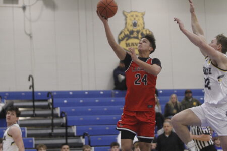 Lawrence sophomore Joey Dooley goes up for a layup in a 75-56 loss to Andale on Monday, Jan. 19, 2026, in Halstead.