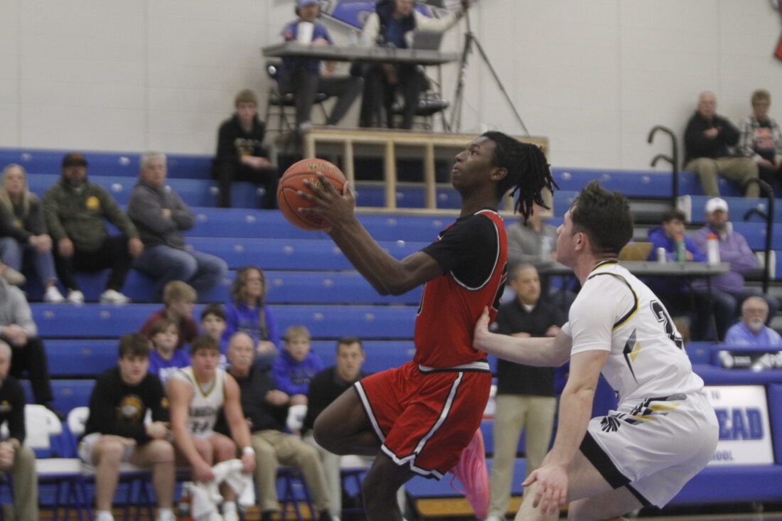 Lawrence sophomore Truth Pope goes up for a layup in a 75-56 loss to Andale on Monday, Jan. 19, 2026, in Halstead.
