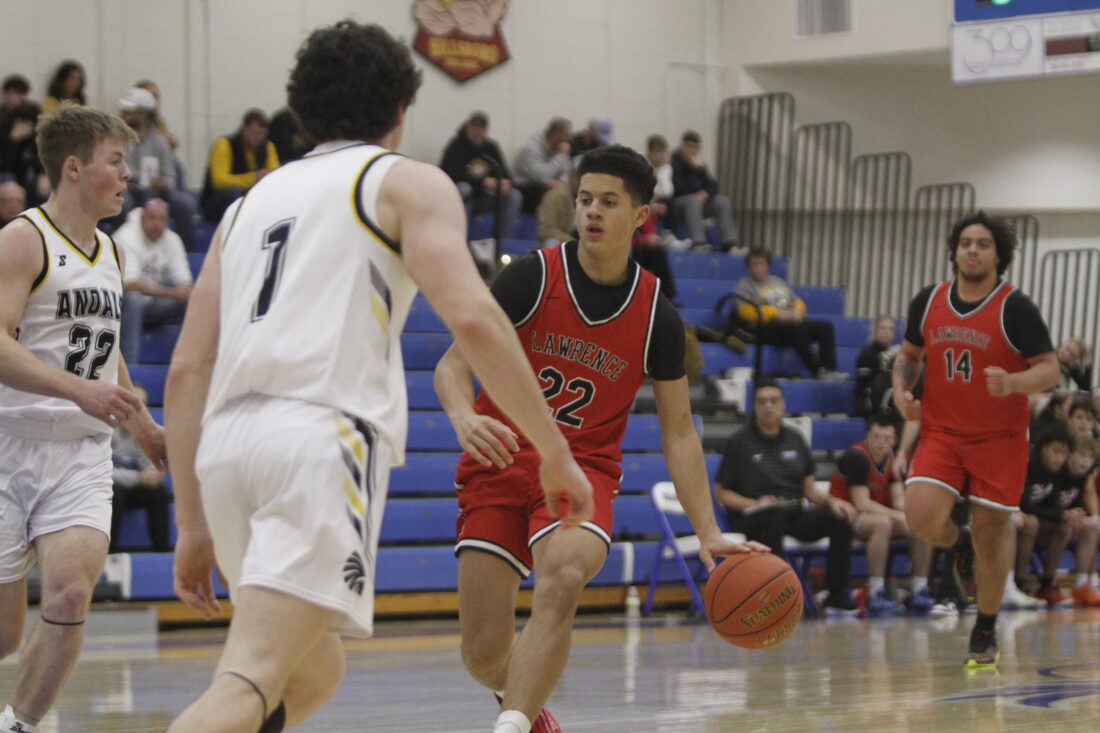Lawrence sophomore Lincoln Neuhofel dribbles the ball in a 75-56 loss to Andale on Monday, Jan. 19, 2026, in Halstead.