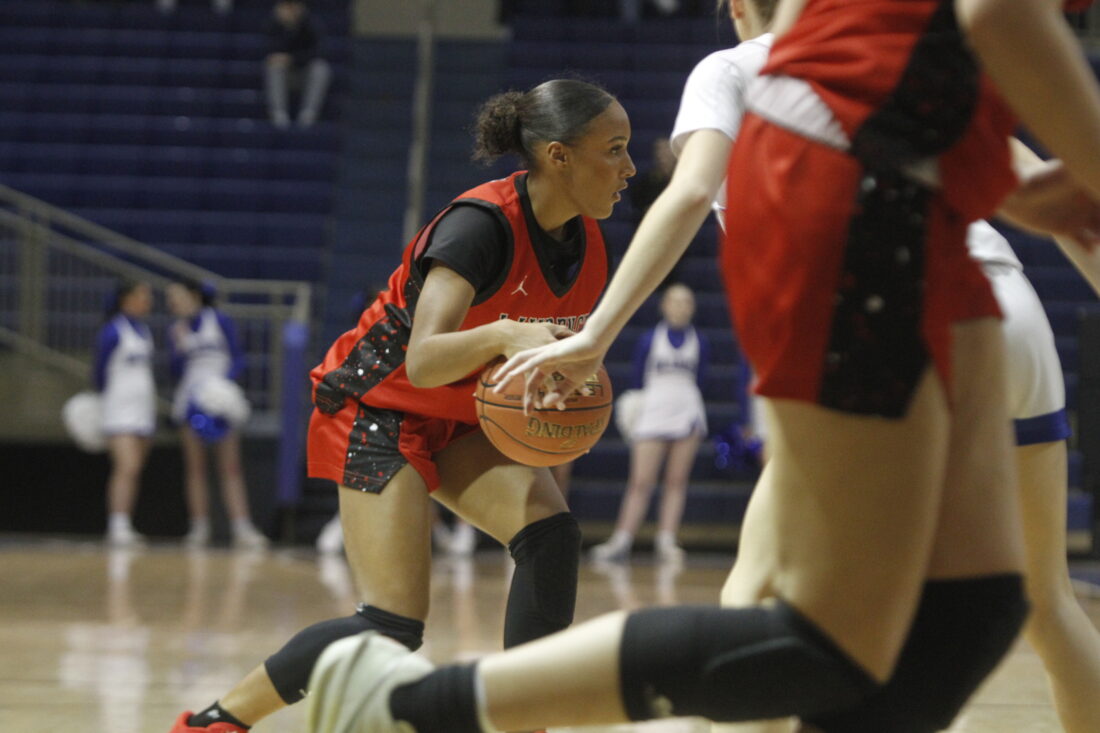 Lawrence freshman Layla Simmons dribbles the ball in a 45-40 loss to Washburn Rural on Tuesday, Jan. 20, 2026, in Topeka.