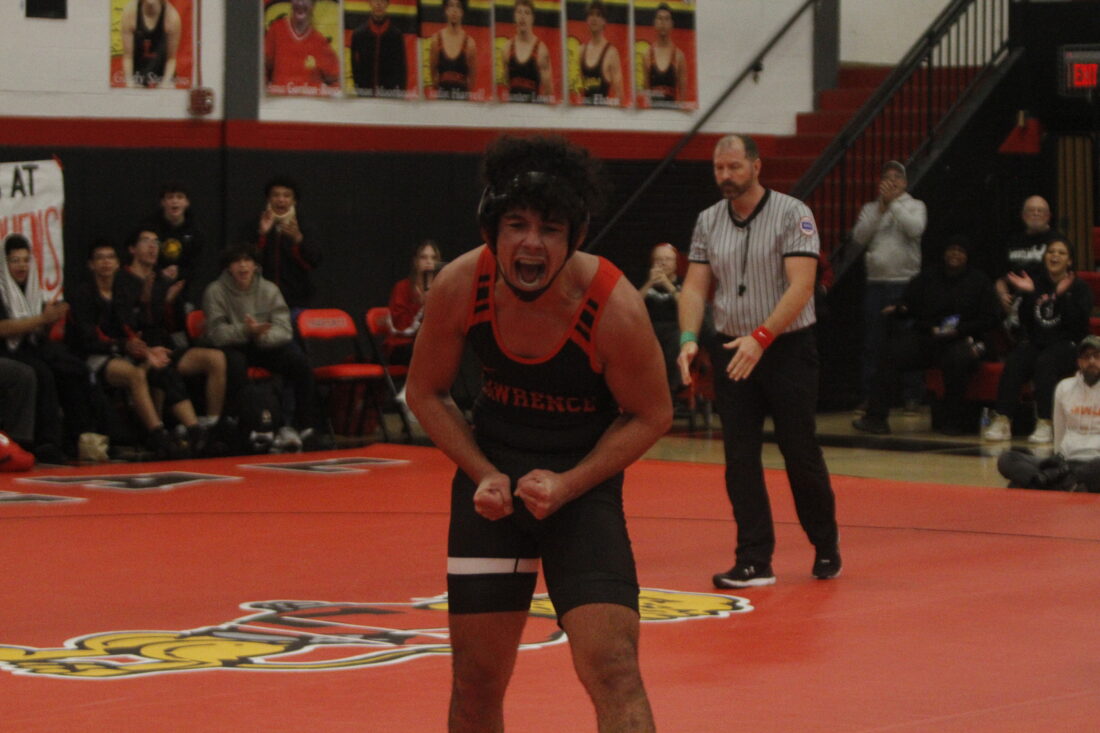 Lawrence’s Jadin Harrell shouts in celebration after a win in the City Showdown wrestling dual at Lawrence on Jan. 21, 2026, in Lawrence.