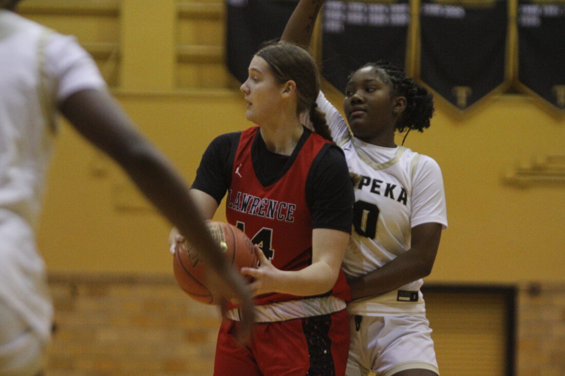 Lawrence junior Cami Nauholz looks to pass in a 75-72 loss to Topeka High in the Capital City Classic on Friday, Jan. 30, 2026, in Topeka.