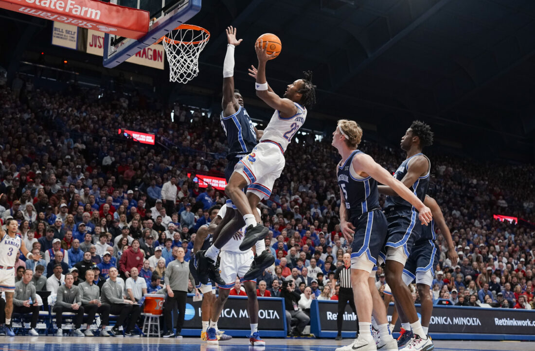 Kansas guard Darryn Peterson (22) floats in for a bucket against BYU during the first half on Saturday, Jan. 31, 2026 at Allen Fieldhouse. Photo by Nick Krug
