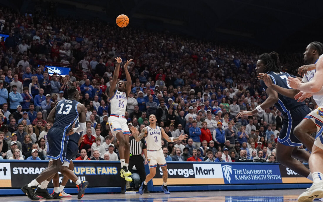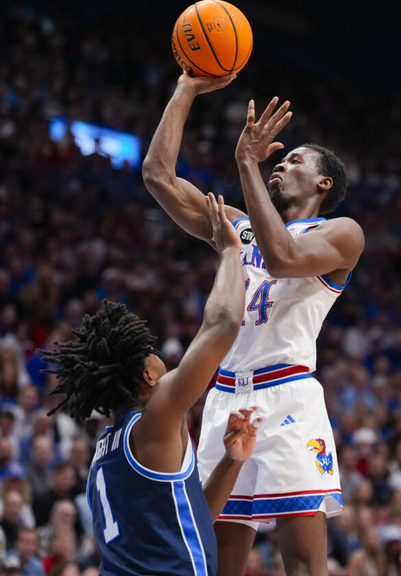 Kansas guard Melvin Council Jr. (14) hangs for a shot over BYU guard Robert Wright III (1) during the first half on Saturday, Jan. 31, 2026 at Allen Fieldhouse. Photo by Nick Krug