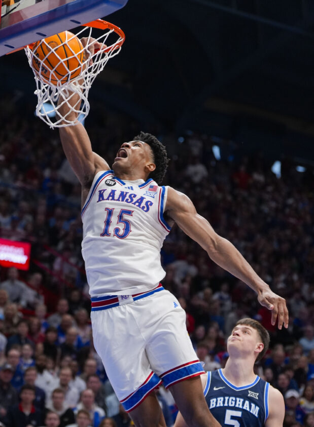 Kansas forward Bryson Tiller (15) hangs for a shot against BYU during the first half on Saturday, Jan. 31, 2026 at Allen Fieldhouse. Photo by Nick Krug