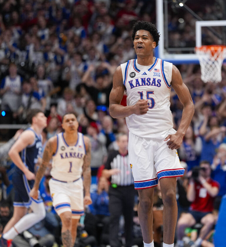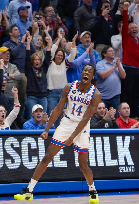 Kansas forward Bryson Tiller celebrates during a run by the Jayhawks in the second half on Saturday, Jan. 31, 2026 at Allen Fieldhouse. Photo by Nick Krug