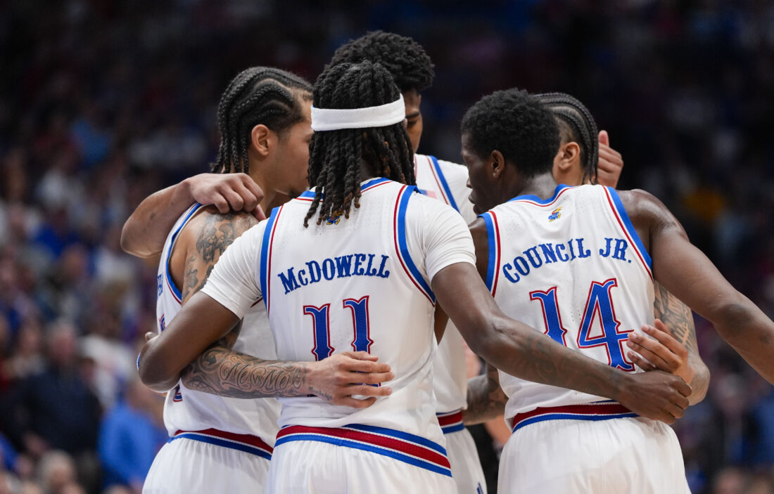 The Jayhawks come together in a huddle during the second half on Saturday, Jan. 31, 2026 at Allen Fieldhouse. Photo by Nick Krug